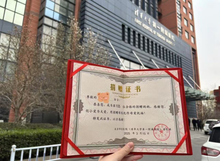 北京华信医院母乳库颁发的捐赠证书。 受访者供图